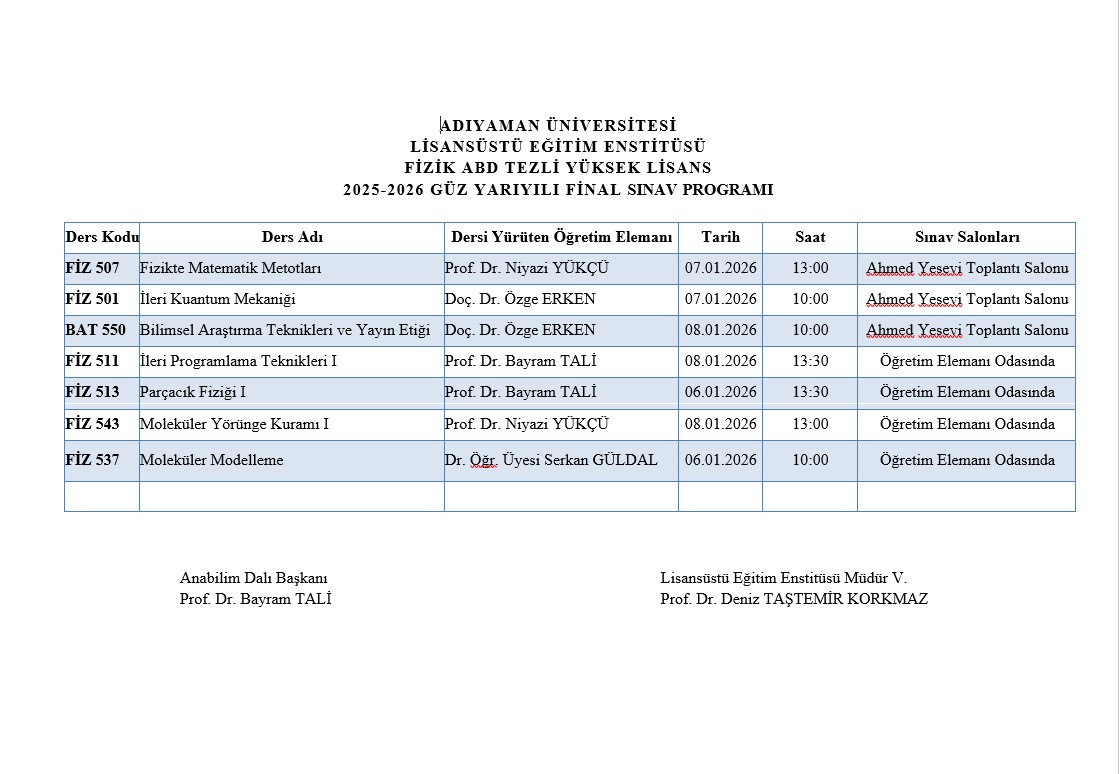 2025-2026 Güz Yarıyılı Final Sınav Programı