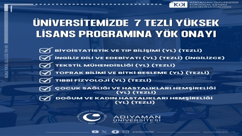 03Eyl2025Adıyaman Üniversitesi’nin Tezli Yedi Yüksek Lisans Programına YÖK OnayıAdıyaman Üniversitesi Lisansüstü Eğitim Enstitüsü bünyesinde açılması planlanarak başvurusu yapılan yedi tezli yüksek li...